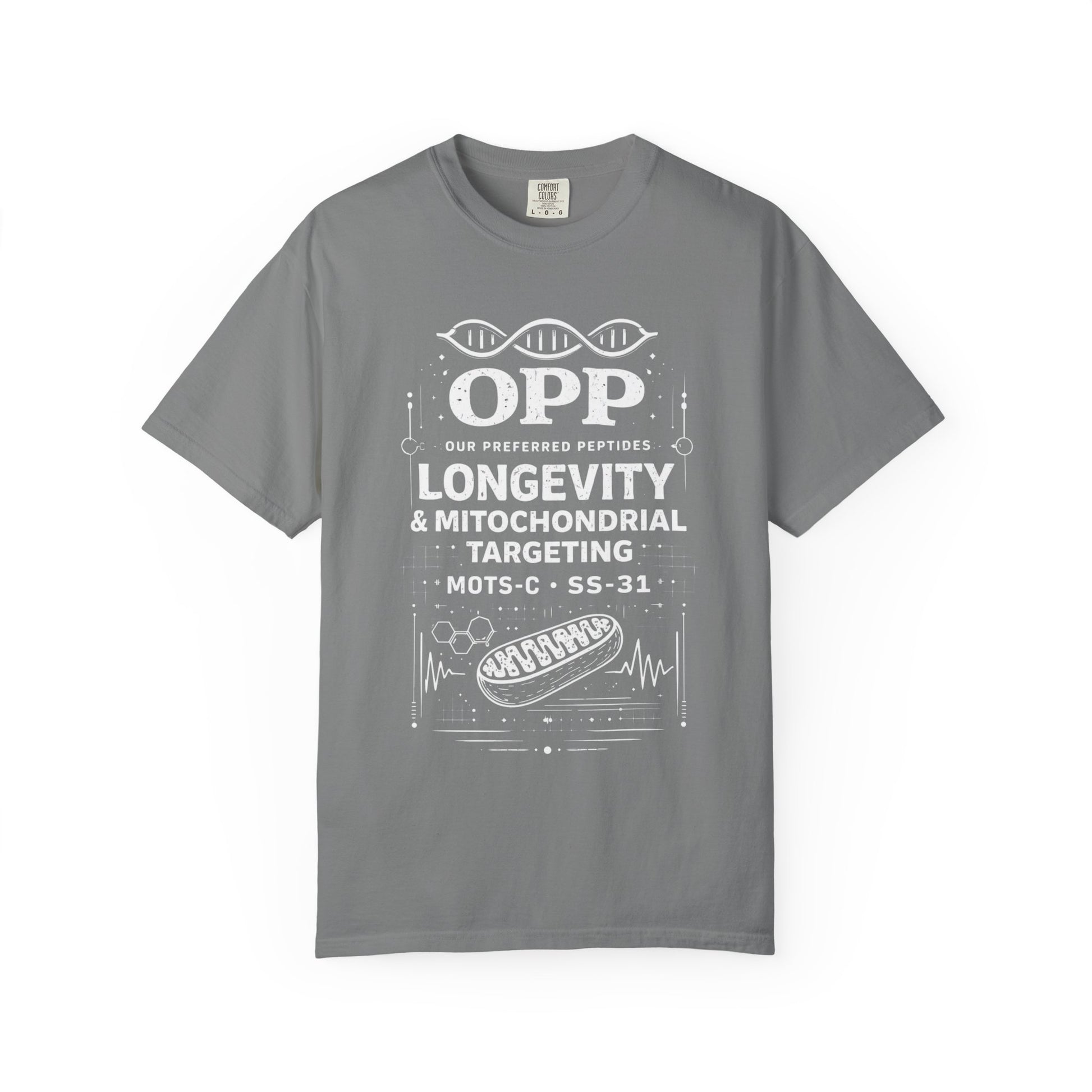 The OPP Longevity Peptides tee is designed for biohackers who play the long game. Mitochondrial performance optimization for those who understand that longevity is the ultimate performance metric.