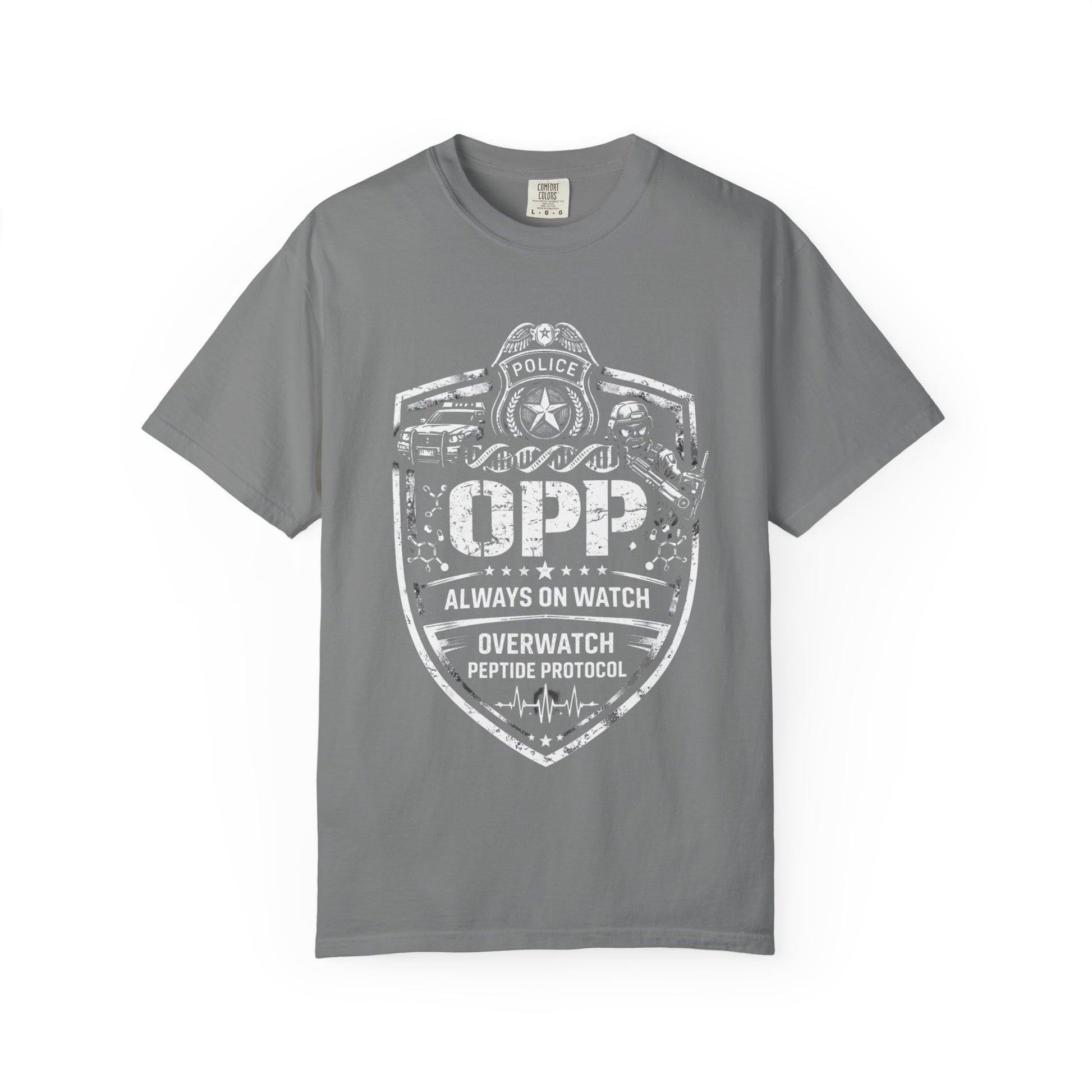 The OPP Police Overwatch Tee is designed for law enforcement officers who understand that staying sharp requires optimization. Overwatch Peptide Protocol for those who protect and serve.
